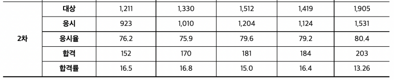 감정평가사 2차의 합격률은 상당히 낮은 편에 속하는 15%대입니다. 최근 5년 치의 자료를 살펴보면 15% 수준을 꾸준히 유지하고 있고 2021년의 경우는 13.26% 라는 낮은 합격률을 확인해 볼 수가 있습니다.