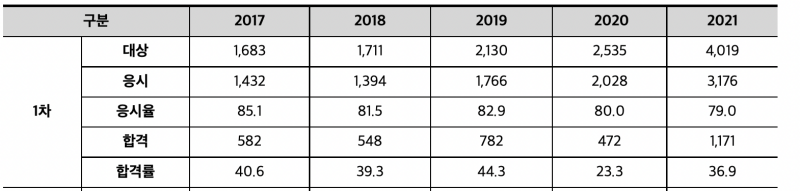5년 치의 자료를 살펴보면 평균 20 ~ 40% 대의 합격률을 보여주고 있습니다. 눈여겨볼 것은 최근 2년 동안 합격률이 상대적으로 낮아 2020년에는 23.3%의 낮은 합격률을 보였다는 것입니다. 그리고 매년 응시자가 급격하게 늘고 있는 것을 보면 감정평가사의 인기가 높아지고 있는것를 알 수 있습니다.
