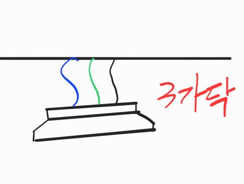 다운라이트를 탈거하면 그림과 같이 전선이 3가닥 있습니다.(간혹 2가닥도 있음) 여기서 신경 써야 할 부분은 녹색선(접지선)으로 새 제품 연결 시 반드시 녹색은 녹색선끼리 연결을 해줘야 합니다. 나머지 두 가닥은 서로 방향이 바뀌어도 문제가 없습니다.